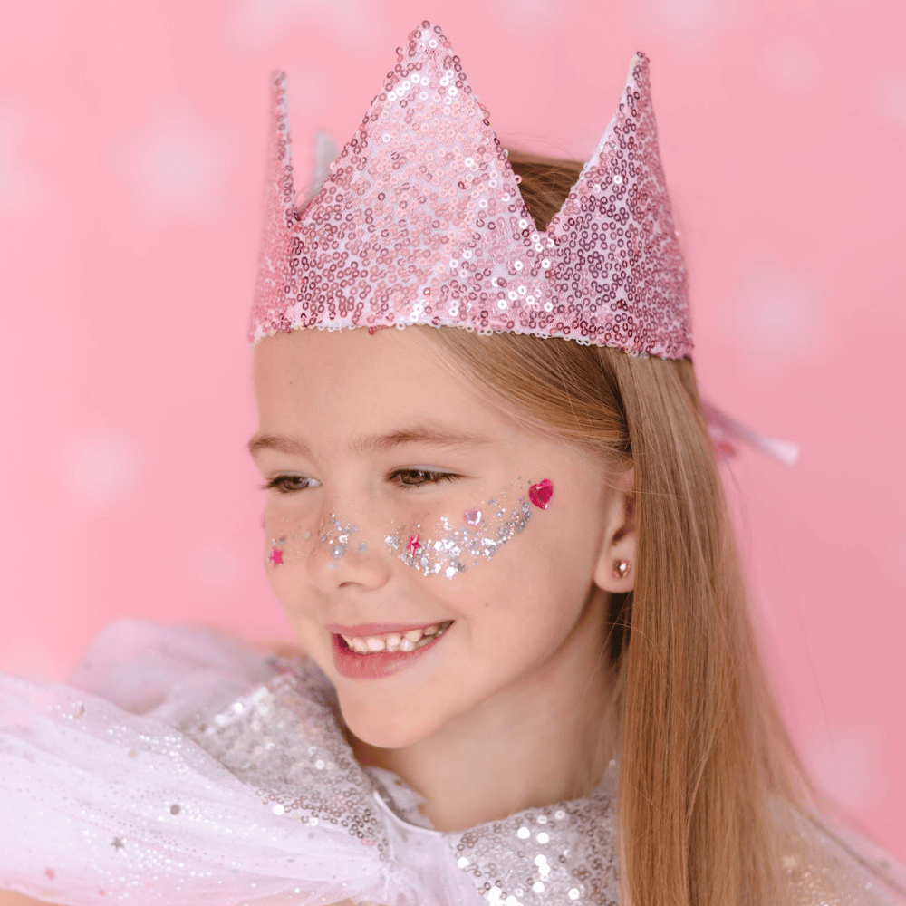 - 1 Crown: A lightweight crown adorned with a reversible sequin design and adjustable ribbon closure — comfortable, flexible, and fit for royalty.