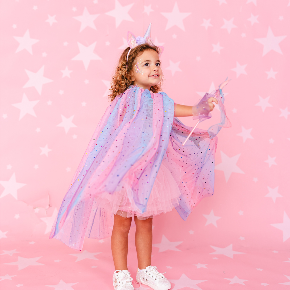 Capes are made with super soft tulle (that doesn’t scratch or itch!) and paired with a matching wand and headband. This 3-piece set comes packaged on a white hanger card making it super easy to gift!