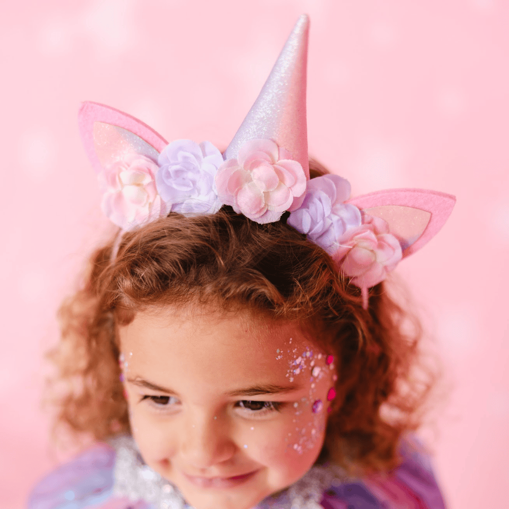 • 1 Unicorn Headband: Complete the look with a comfortable headband featuring a plush unicorn horn, glittering ears, and floral accents — fit for any unicorn-in-training.